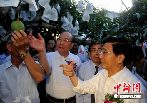 郭聲琨說,我們來到臺灣,向農(nóng)民兄弟學(xué)習(xí)水果的生產(chǎn)和品種的研發(fā),以及水果的營銷。剛才看了你們的果園,我非常高興,因為臺南和附近幾個縣的水果品質(zhì)相當(dāng)優(yōu)良,你們的種植技術(shù)相當(dāng)先進,研發(fā)力量也非常強大。廣西和臺灣均處在北回歸線上,氣候地理條件非常相近,廣西和臺灣的農(nóng)產(chǎn)品有很多互補和相似的地方。我們這次來,一是來學(xué)習(xí),二是來尋找合作機會,三是采購水果和農(nóng)產(chǎn)品。我們希望通過農(nóng)產(chǎn)品的采購活動,今后能夠建立經(jīng);、制度化的采購制度安排,使得兩岸、特別是桂臺之間的農(nóng)產(chǎn)品和水果,形成采摘季節(jié)、品種及果品質(zhì)量上的互補。我相信這對我們雙方都有利,這樣可以惠及臺灣廣大果農(nóng),豐富廣西的水果市場。