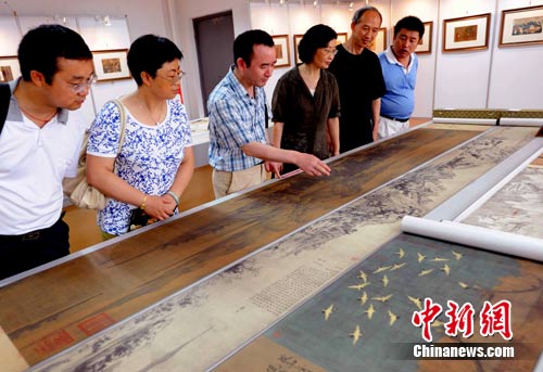 7月8日,觀眾在福州舉辦的“兩岸故宮高仿真宮廷畫(huà)聯(lián)展”上被展出的一幅合璧版仿真《富春山居圖》所深深吸引!陡淮荷骄訄D》是元朝畫(huà)家黃公望的代表作,是其為無(wú)用師和尚所繪,以浙江富春江為背景,全圖用墨淡雅,山和水的布置疏密得當(dāng),墨色濃淡干濕并用,極富變化,被譽(yù)為中國(guó)十大傳世名畫(huà)之一,其流傳經(jīng)歷充滿傳奇色彩,目前兩岸各存一段。據(jù)了解,此次“兩岸故宮高仿真宮廷畫(huà)聯(lián)展”共展出130余件高仿真作品,囊括了隋唐五代、宋、元、明、清和近代各個(gè)時(shí)期書(shū)畫(huà)名家的傳世佳作。