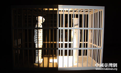 這是朱銘的最新作品《人間系列:囚》之一。黑白各半的牢籠,囚著兩個相對望的人,分別象征好人和壞人,朱銘以“地域在人間,人間有天堂,問君何處去,但憑一念間”概念說明:成為好人/壞人,自囚/囚人,都僅在一念之間。(中國臺灣網(wǎng) 董潔 攝)