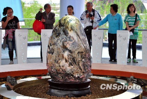 5月29日,游客在觀看上海世博園臺灣館的“鎮(zhèn)館之寶”——玉山玫瑰石。 中新社發(fā) 沈春琛 攝
