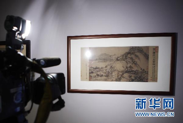 7月29日,電視記者在發(fā)布會舉行前拍攝《剩山圖》的復(fù)制品。當(dāng)日,臺北故宮博物院院長周功鑫在此間宣布,臺北故宮將于2011年6月至9月推出“山水合璧——黃公望與富春山居圖特展”,重現(xiàn)元代畫家黃公望曠世杰作《富春山居圖》的原貌。 新華社記者 費(fèi)茂華 攝