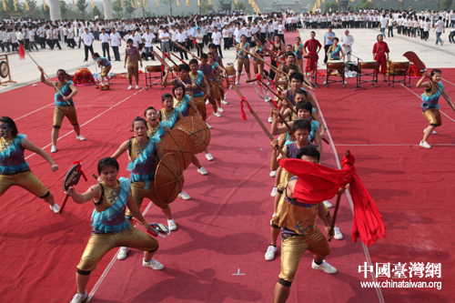 中國臺灣網(wǎng)8月9日隨州消息 今天上午,炎帝神農(nóng)祭祀大典在神農(nóng)故里隨州市舉行。大典上,臺灣大學(xué)生為在場嘉賓獻上了一場頗具臺灣特色的“宋江陣”表演,這也是臺灣“宋江陣”首次亮相大陸。