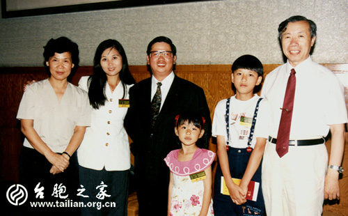 1994年隨第二屆臺(tái)灣小天使到大陸交流時(shí),翁林澄一家與為時(shí)任全國(guó)臺(tái)聯(lián)宣傳部長(zhǎng)的焦萬(wàn)曼(左一、勾德元(右一)在一起。右二為翁林宇。全國(guó)臺(tái)聯(lián)文宣部/提供