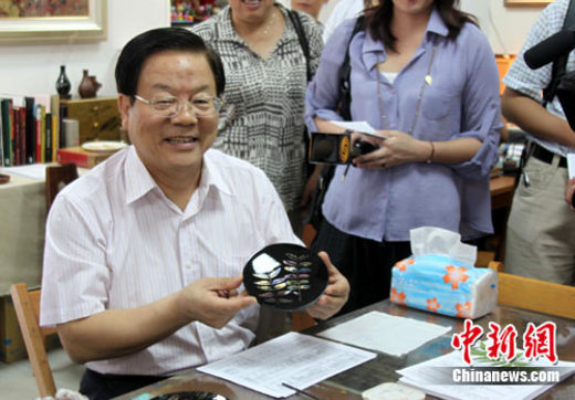 4日,來到臺(tái)灣中部的中華文化聯(lián)誼會(huì)訪問團(tuán)參觀設(shè)立于南投草屯的臺(tái)灣工藝研究發(fā)展中心。蔡武一行用1個(gè)多小時(shí),在研發(fā)中心負(fù)責(zé)人引領(lǐng)下,逐個(gè)工坊、展室進(jìn)行參觀。