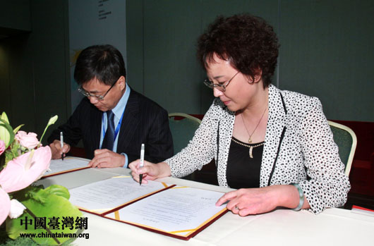 中國(guó)臺(tái)灣網(wǎng)總經(jīng)理兼總編輯劉曉輝(右)與臺(tái)灣中華聯(lián)合集團(tuán)執(zhí)行長(zhǎng)施義忠在“2010年兩岸互聯(lián)網(wǎng)發(fā)展論壇上”簽約。(中國(guó)臺(tái)灣網(wǎng)發(fā) 邱榮吉攝)