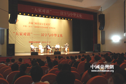 中國(guó)臺(tái)灣網(wǎng)9月17日北京消息 今天上午,一場(chǎng)主題為“大家對(duì)談——漢字與中華文化”的講座在中國(guó)藝術(shù)研究院舉行,作為首屆兩岸漢字藝術(shù)節(jié)的一部分,“開(kāi)卷·漢字:高校漢字藝術(shù)講座”系列活動(dòng)就此拉開(kāi)帷幕。4位來(lái)自?xún)砂兜摹按蠹摇薄S嘉璐、林谷芳、田青、黃光男齊聚一堂,或侃侃而談,或偶有爭(zhēng)論,或與觀眾親切互動(dòng),觀點(diǎn)激蕩中、言談舉止間,無(wú)不流露出對(duì)“方塊字”的贊美、對(duì)自己民族文字的自豪。