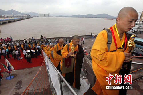 圖為護(hù)送觀音寶像的高僧正準(zhǔn)備踏上郵輪。中新網(wǎng)發(fā) 雍凱 攝