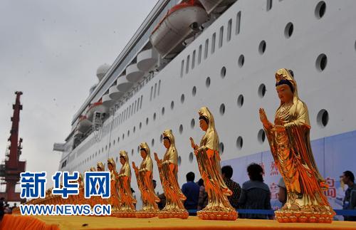隨著一聲汽笛長鳴,載有1000尊南海觀音佛像的郵輪于27日下午駛離舟山老塘山碼頭,開往臺灣為民眾祈福。