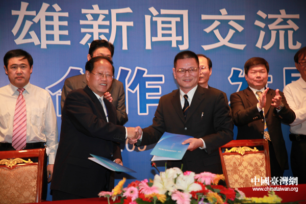 太原市新聞工作者協(xié)會(huì)主席黃征與高雄市新聞?dòng)浾吖珪?huì)理事長(zhǎng)馬道明共同簽署“四點(diǎn)共識(shí)”。 (中國(guó)臺(tái)灣網(wǎng) 田云鵬 攝)