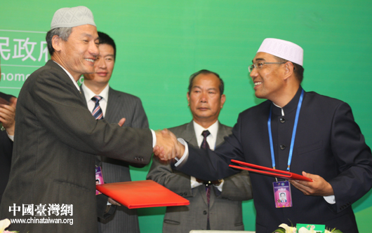 臺(tái)灣“中國回教協(xié)會(huì)”與寧夏伊斯蘭教協(xié)會(huì)簽訂“HALAL(清真)產(chǎn)業(yè)和文化交流合作”協(xié)議。 (中國臺(tái)灣網(wǎng) 王偉 攝)