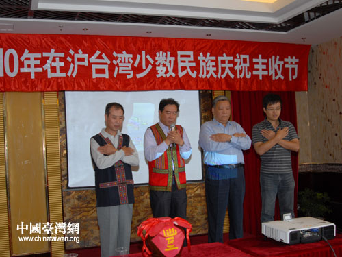 中國(guó)臺(tái)灣網(wǎng)10月11日上海消息 10月10日,上海市臺(tái)聯(lián)舉辦2010年在滬臺(tái)灣少數(shù)民族豐收節(jié)聯(lián)誼活動(dòng),在滬的臺(tái)灣阿美族、排灣族、泰雅族、平埔族等少數(shù)民族家庭20余戶(hù)50余人參加了隆重的豐收節(jié)慶祝活動(dòng)。上海市臺(tái)聯(lián)副會(huì)長(zhǎng)張企龍致辭,市民宗委李偉民處長(zhǎng)應(yīng)邀出席并講話,市臺(tái)聯(lián)副秘書(shū)長(zhǎng)江國(guó)強(qiáng)介紹了臺(tái)灣少數(shù)民族慶祝豐收節(jié)的傳統(tǒng)習(xí)俗及臺(tái)灣少數(shù)民族稱(chēng)謂的變化,并與高文海、甘錦凱、韓若冰先生分別代表本氏族共同主持祭典。