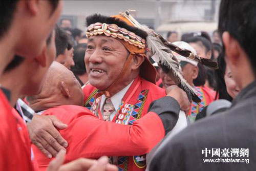 開幕式現(xiàn)場,身著鮮艷民族服裝的臺灣阿里山鄒人部落鄉(xiāng)親一行15人在臺灣少數(shù)民族民意代表簡東明的帶領下來到“臺灣村”,探訪300多年前遷居到此的宗親后裔!芭_灣村”村民們穿著節(jié)日盛裝列隊歡迎來自海峽對岸的親人。大家相見熱情擁抱,共話同宗之情,祭拜共同的祖先依那思羅夫婦。