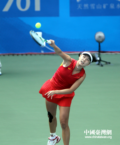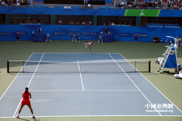 中國(guó)臺(tái)灣網(wǎng)11月16日廣州消息 第十六屆廣州亞運(yùn)會(huì)女子網(wǎng)球團(tuán)體賽決賽正在進(jìn)行,中國(guó)隊(duì)同中華臺(tái)北隊(duì)展開金牌爭(zhēng)奪戰(zhàn),中國(guó)隊(duì)選手彭帥對(duì)陣中華臺(tái)北隊(duì)選手張凱貞,奉獻(xiàn)第一場(chǎng)單打。(記者 鐘寶華)