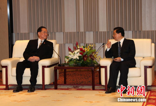 當(dāng)?shù)貢r間2010年11月13日上午9時,中共中央總書記胡錦濤在橫濱下榻飯店內(nèi)會見中國國民黨榮譽(yù)主席連戰(zhàn)。胡錦濤12日傍晚抵達(dá)日本橫濱,出席在這里舉行的亞太經(jīng)合組織(APEC)領(lǐng)導(dǎo)人第18次非正式會議。中新社記者 張朔 攝