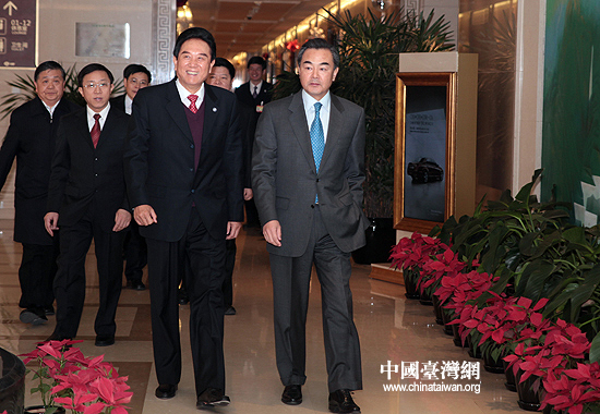 12月20日上午,中共中央臺辦、國務院臺辦主任王毅在首都機場為啟程赴臺北參加第六次兩岸兩會領導人會談的海協會會長陳云林送行。 (中國臺灣網 田云鵬 攝)