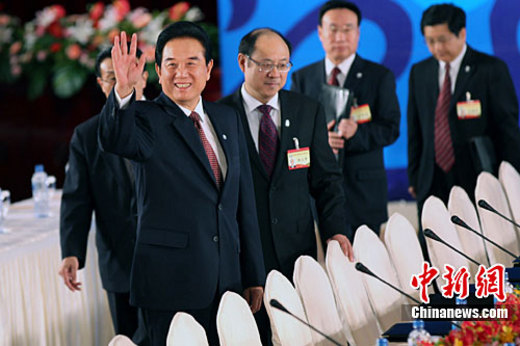 12月21日上午,海協(xié)會會長陳云林與;鶗麻L江丙坤的兩會領(lǐng)導(dǎo)人第六次會談在臺北圓山飯店登場。圖為陳云林在落座前向到場采訪媒體致意。中新社記者 黃少華 攝