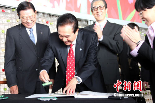 在臺北花博營運(yùn)總部,臺北市長郝龍斌向陳云林致贈(zèng)瓷兔,陳云林則回贈(zèng)自己的書法“花好月圓”。作者:黃少華