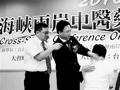 近日,由廣西醫(yī)師協(xié)會、廣西中醫(yī)藥學(xué)會、臺北中醫(yī)師公會、臺灣海峽兩岸醫(yī)藥合作協(xié)會共同舉辦的2010年海峽兩岸中醫(yī)藥學(xué)術(shù)大會在臺大醫(yī)院舉行。這是與會專家現(xiàn)場演示按摩醫(yī)治手法。 劉 巖攝