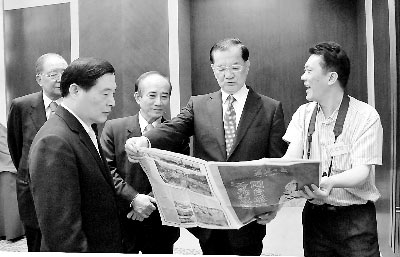 5月9日,連戰(zhàn)在會(huì)見(jiàn)黃小晶省長(zhǎng)率領(lǐng)的福建省經(jīng)貿(mào)文化交流團(tuán)前,看到本報(bào)記者遞上的《福建日?qǐng)?bào)》特刊上刊發(fā)他回龍海祭祖的圖片時(shí)非常高興。 陳夢(mèng)婕 攝