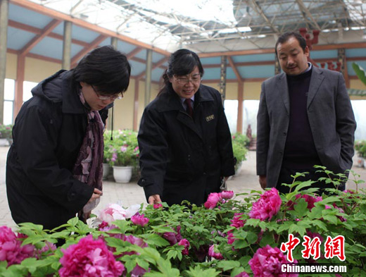 洛陽(yáng)出入境檢驗(yàn)檢疫局工作人員正在對(duì)參展牡丹生長(zhǎng)情況進(jìn)行觀察。