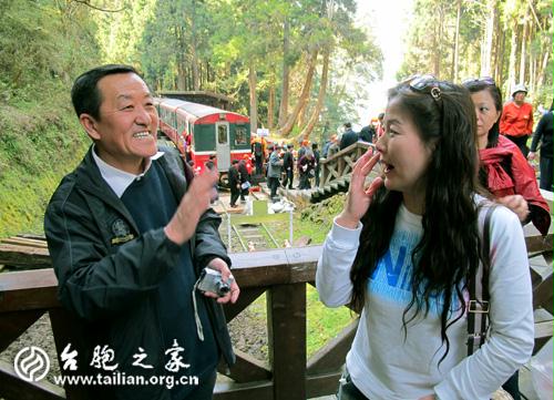 我還沉浸在感慨中,那邊,一個(gè)驚喜出現(xiàn)了。承德作協(xié)主席楊田林竟然遇到了在本市開(kāi)書(shū)店的夫妻倆,我喊過(guò)樊铓搶拍下了這個(gè)場(chǎng)面,阿里山上遇故人,多么難得!其實(shí),遇到驚喜的還有河北臺(tái)聯(lián)的王耀冀會(huì)長(zhǎng),他遇到的人更多,當(dāng)年在邯鄲交通運(yùn)輸集團(tuán)工作時(shí)的老領(lǐng)導(dǎo)和同事,還有他們的親屬十幾個(gè)人。臺(tái)灣開(kāi)放旅游以來(lái),到這里的大陸人越來(lái)越多,相信這樣的奇遇已經(jīng)算不得希奇了! 「鎰e阿里山,雖然又領(lǐng)到一張臺(tái)灣的“名片”,作家們?nèi)匀挥行┎簧。我相信過(guò)不了多久,這一行人中就會(huì)有人再來(lái),而且會(huì)帶著自己的親友一起來(lái)! ∩系密(chē),司機(jī)打開(kāi)了音響,飄來(lái)鄧麗君的《何日君再來(lái)》。王會(huì)長(zhǎng)對(duì)導(dǎo)游說(shuō),鄧麗君是河北大名府人。一句話,再聽(tīng)這首歌就多了一種情愫。用得著如此感傷嗎?隨著兩岸關(guān)系的和平發(fā)展,民眾會(huì)越走越近,常來(lái)常往是一定的。(閻崑 樊铓)新聞中心 兩岸 社會(huì) 國(guó)際 臺(tái)灣頻道