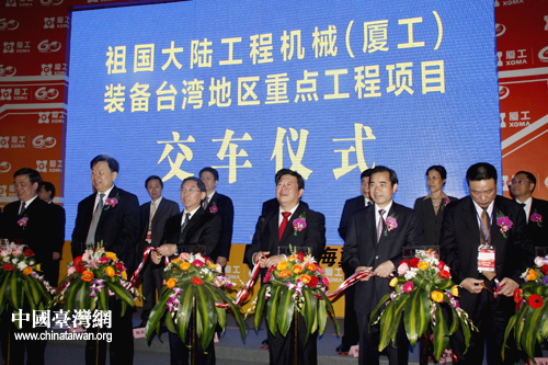 祖國大陸工程機(jī)械(廈工)系列產(chǎn)品裝備臺(tái)灣地區(qū)重點(diǎn)工程項(xiàng)目交車儀式今日在廈工館舉行。國務(wù)院臺(tái)灣事務(wù)辦公室副主任孫亞夫(右三)、福建省委常委、廈門市委書記于偉國等領(lǐng)導(dǎo)為交車儀式剪彩。(中國臺(tái)灣網(wǎng) 高斯斯 攝)