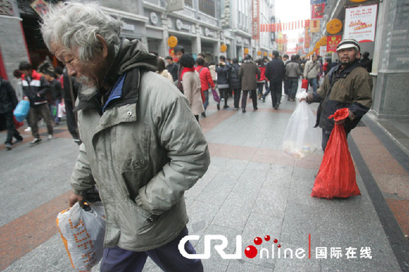 下午4點左右,記者來到上九路的金聲電影院門口,一個穿著藍色褲子的老人倚靠在影院門口,坐在地上忙著整理一堆橫七豎八的空飲料瓶。老人的白發(fā)和胡子非常凌亂,身上的衣物也臟兮兮的。經(jīng)過交流,記者發(fā)現(xiàn)老人的聽力有問題,必須大聲喊著才能聽得到。