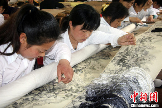 4月15日,在“中國湘繡之鄉(xiāng)”長沙沙坪鎮(zhèn)的一家湘繡工區(qū)內(nèi),繡師正對(duì)照《富春山居圖》合并卷全圖復(fù)制件專注刺繡。中新社發(fā) 鄧霞 攝