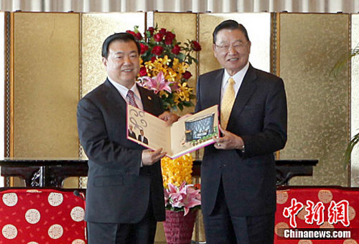安徽省長(zhǎng)王三運(yùn)率領(lǐng)的“安徽經(jīng)貿(mào)文化寶島行”參訪團(tuán),4月18日午間抵達(dá)臺(tái)北,將展開(kāi)為期8天的交流活動(dòng)。圖為王三運(yùn)(左)抵臺(tái)后,在臺(tái)北圓山飯店會(huì)見(jiàn)臺(tái)灣;鶗(huì)董事長(zhǎng)江丙坤。中新社發(fā) 路梅 攝