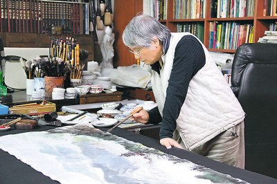圖為江明賢在臺(tái)北的畫(huà)室創(chuàng)作。