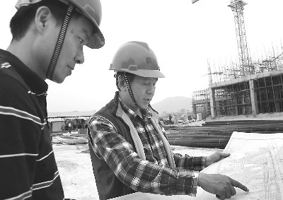 汪培昇(右)與技術(shù)人員在施工現(xiàn)場(chǎng)。