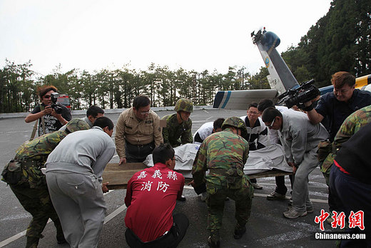 4月27日,臺(tái)灣阿里山景區(qū)發(fā)生小火車翻車事故,現(xiàn)場(chǎng)被當(dāng)?shù)鼐椒怄i。下午5點(diǎn),最后兩個(gè)大陸游客遇難者遺體被抬上直升飛機(jī)。中新社發(fā) 沈存旭 攝