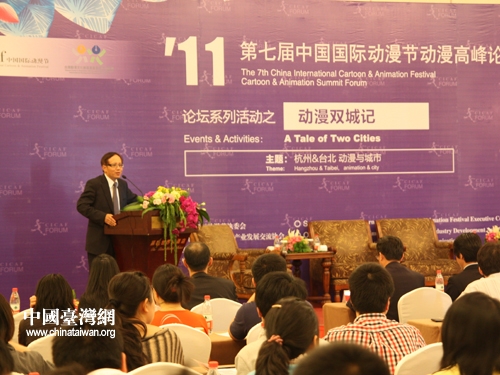 4月28日下午,第七屆中國(guó)國(guó)際動(dòng)漫節(jié)“動(dòng)漫雙城記”高峰論壇開幕,臺(tái)灣尖端出版集團(tuán)執(zhí)行長(zhǎng)黃鎮(zhèn)隆發(fā)表以“讓城市充滿活力的動(dòng)漫”為主題的演講。(中國(guó)臺(tái)灣網(wǎng) 李丹 攝)