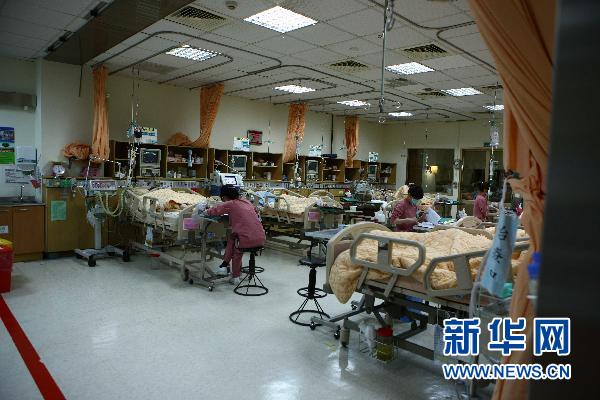 新華社照片,嘉義(臺灣),2011年4月28日 阿里山火車事故傷者繼續(xù)接受治療 4月28日,工作人員在臺灣嘉義市圣馬爾定醫(yī)院的加護病房內(nèi)忙碌。當(dāng)日,在阿里山火車事故中受傷的大多數(shù)乘客已出院,目前留在圣馬爾定醫(yī)院接受治療的還有16人,其中兩名重傷員仍在加護病房中接受治療。臺灣阿里山27日中午發(fā)生小火車翻車事故,截至當(dāng)天晚間11時,事故已造成5名大陸游客罹難,百余名大陸游客不同程度受傷。 新華社記者龔兵攝