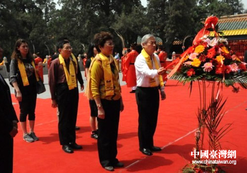 臺灣海峽兩岸觀光旅游協(xié)會名譽會長郭蔡文、會長賴瑟珍在曲阜孔廟大成殿拜謁孔子(圖片來源:山東省臺辦)