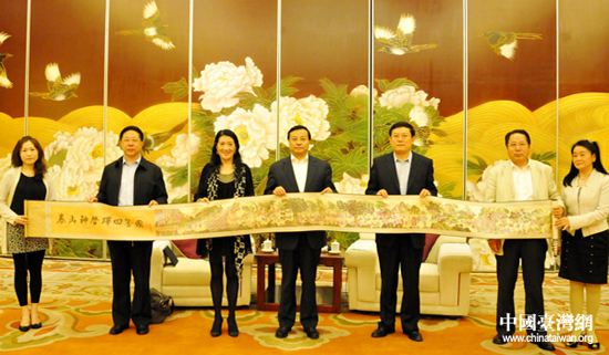 臺(tái)灣中華兩岸經(jīng)貿(mào)投資協(xié)會(huì)常務(wù)副會(huì)長(zhǎng)黃紫玉女士(左三)到山東訪問,山東省副省長(zhǎng)才利民(中)等在濟(jì)南會(huì)見了黃紫玉一行。(圖片來源:山東省臺(tái)辦)