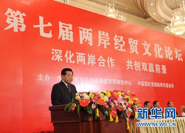 5月8日,第七屆兩岸經(jīng)貿(mào)文化論壇在四川成都閉幕。中共中央政治局常委、全國(guó)政協(xié)主席賈慶林和中國(guó)國(guó)民黨榮譽(yù)主席吳伯雄出席閉幕會(huì)。這是中共中央政治局常委、全國(guó)政協(xié)主席賈慶林致辭。 新華社記者 饒愛(ài)民 攝