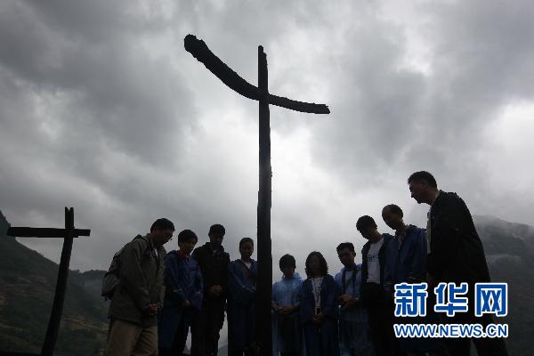 資料圖片:5月9日,在“5.12”汶川地震重災區(qū)四川省青川縣東河口地震遺址公園,在青川參加災民安置房援建工作的香港迪士尼樂園的志愿者在雨中默哀。 新華社記者 任正來 攝