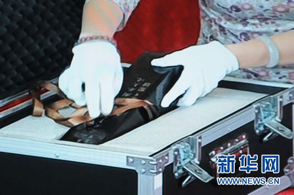 5月11日,工作人員將《富春山居圖》前半段(剩山圖)打包裝箱,準(zhǔn)備啟運。(電視截圖) 新華社發(fā)