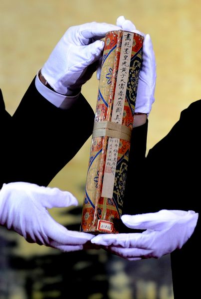 5月11日,工作人員在啟運(yùn)儀式上展示《富春山居圖》(剩山圖)。 當(dāng)日,浙江省博物館的“鎮(zhèn)館之寶”《富春山居圖》前半段(剩山圖)赴臺(tái)啟運(yùn)儀式隆重舉行!陡淮荷骄訄D》(剩山圖)在浙江省博物館點(diǎn)交啟運(yùn),將經(jīng)由北京后赴臺(tái),于6月1日在“山水合壁——黃公望與《富春山居圖》特展”上,與臺(tái)北故宮博物院所藏《富春山居圖》(無(wú)用師卷)聯(lián)合展出。這將是該畫作兩部分在分別360年后首次實(shí)現(xiàn)合璧。新華社發(fā)(梁臻 攝)