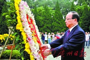 昨日下午4時(shí)30分,蔣孝嚴(yán)一行抵達(dá)廣州后直接從機(jī)場來到黃花崗七十二烈士陵園,在陵園正大門前等候的廣州市政協(xié)主席林元和上前迎接。一身深藍(lán)色西裝的蔣孝嚴(yán),雖然已經(jīng)年近70歲,但看上去仍然精神矍鑠,在林元和的陪同下,蔣孝嚴(yán)從“浩氣長存”的大門處步行前往七十二烈士墓。
