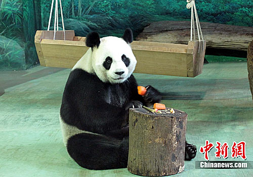 圖為圓圓17日下午進食胡蘿卜。中新社發(fā) 路梅 攝