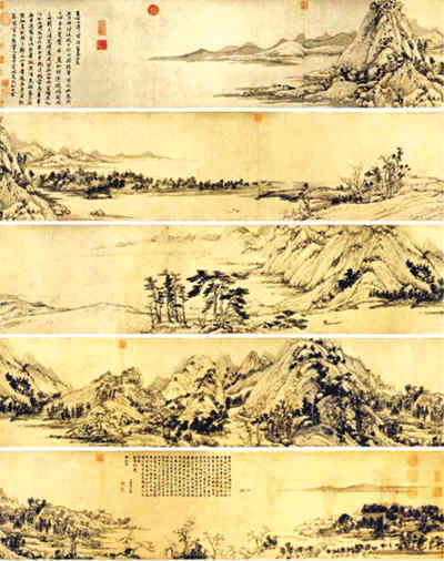 《富春山居圖》是元朝畫家黃公望為無用師和尚所繪,以浙江富春江為背景,全圖用墨淡雅,山和水的布置疏密得當(dāng),墨色濃淡干濕并用,極富于變化,被盛贊“此畫來自真山真水,又超越了真山真水”,是中國十大傳世名畫之一。明朝末年此畫傳到收藏家吳洪裕手中,吳洪裕極為喜愛此畫,甚至在臨死前下令將此畫焚燒殉葬,吳洪裕的侄子從火中搶救出,但此時畫已被燒成一大一小兩段。前段稱《剩山圖》,現(xiàn)藏浙江省博物館;后段較長稱《無用師卷》,現(xiàn)藏臺北故宮博物院。