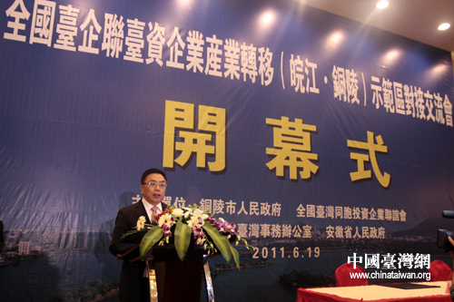 中國臺灣網(wǎng)6月19日銅陵消息 全國臺企聯(lián)臺資企業(yè)產(chǎn)業(yè)轉(zhuǎn)移(皖江·銅陵)示范區(qū)對接交流會開幕式今天上午在安徽省銅陵市舉行。全國臺企聯(lián)會長郭山輝、監(jiān)事長丁鯤華、常務(wù)副會長兼秘書長何世忠等臺企聯(lián)主要代表,國臺辦交流局局長程金中、經(jīng)濟(jì)局處長于紅以及當(dāng)?shù)厥∈蓄I(lǐng)導(dǎo)出席開幕式。