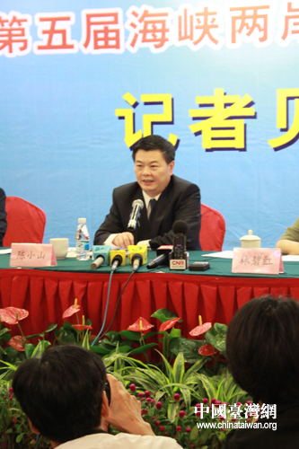 中共梅州市委副書記陳小川介紹論壇情況并回答記者提問。(中國(guó)臺(tái)灣網(wǎng) 馮江 攝)