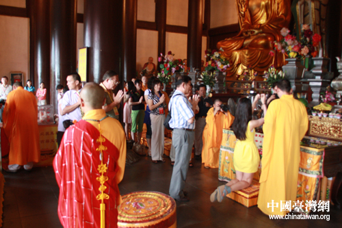 上午,南山寺的金山大殿佛香裊裊,莊嚴(yán)肅穆,兩岸的40余名媒體記者在智法大法師的主持下,雙手合十,懷著虔誠(chéng)的心共同向佛祖祈福,祈求兩岸民眾相親相愛,兩岸關(guān)系和平發(fā)展。隨后,在金山大殿前,兩岸媒體記者共同將象征兩岸和平的108只和平鴿放飛向藍(lán)天。