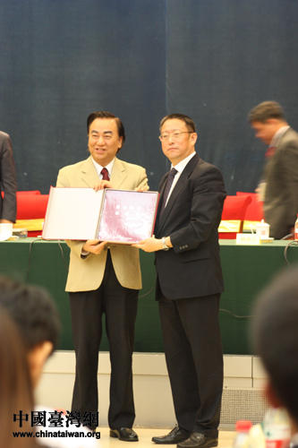 “杰青團”榮譽團長馮滬祥和鄭建邦互贈禮物。(中國臺灣網(wǎng) 馮江 攝)