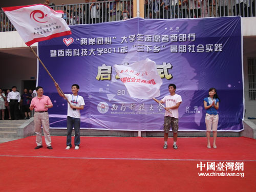 綿陽(yáng)市臺(tái)辦主任陳福林、共青團(tuán)綿陽(yáng)市委黨組成員任彤梅共同為第五屆“兩岸同心”大學(xué)生志愿者西部行和“西南科技大學(xué)2011年暑期社會(huì)實(shí)踐赴游仙區(qū)團(tuán)隊(duì)”授旗。