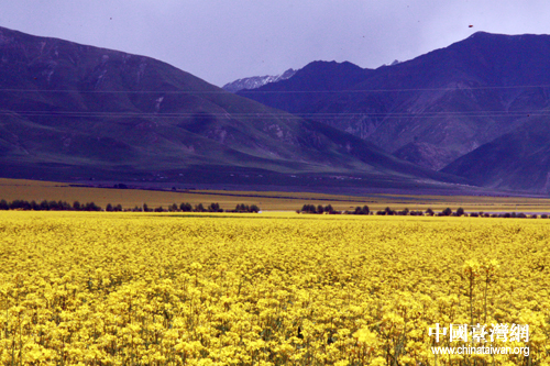 油菜與青稞混種,成壟的油菜花構(gòu)成一幅天然的油彩畫。(中國臺灣網(wǎng) 楊云濤攝)