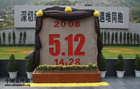“5·12”地震紀(jì)念碑,擺滿的鮮花寄托著嘉賓們對(duì)逝者的哀思與悼念。(中國(guó)臺(tái)灣網(wǎng) 趙輝 攝)